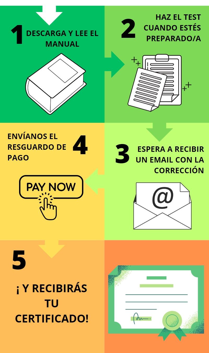 - Una vez corrijamos el test, recibirás un email indicándote si has aprobado o no, y la información de pago en caso de haber obtenido la puntuación necesaria (se hace mediante transferencia bancaria).