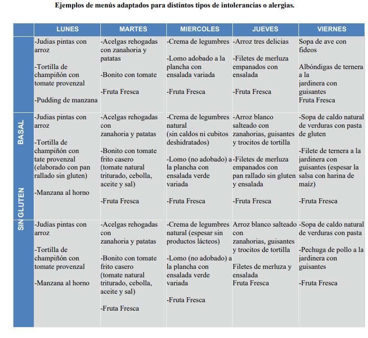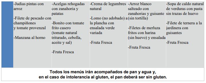 Todos los menús deberán ir acompañados de pan y agua y, en el caso de intolerancia algluten, el pan deberá ser sin gluten.