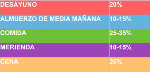 En la distribución de alimentos se aplican las pautas establecidas para la población general, 4ó 5 comidas distribuyendo el total calórico en: 25% desayuno, 30%-35% comida, 15% merienda y 25-30% cena; ó 20% en desayuno, 10-15% almuerzo de media mañana, 25-35% comida, 10-15% merienda y 25% cena.