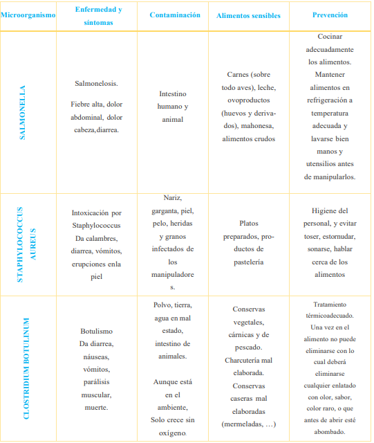 Las enfermedades provocadas por bacterias más habituales son: salmonella, campilobacteriosis, escherichia coli, listeria y vibrio cholerae. Las manifestaciones de las enfermedades alimentarias producidas por microbios generalmente son de tipo gastrointestinal, así pues, los síntomas gene-rales de la mayoría de enfermedades microbianas son: calambres o dolor abdominal, diarrea (aveces con sangrado), vómitos y fiebre.La presencia de bacterias en los alimentos no siempre es visible, es decir, no siempre que un alimento esté contaminado por la presencia de bacterias alimentarias, este va a presentar cambios en el sabor u olor o se va a ver alterado el aspecto del alimento. Por este motivo es tan importante mantener una correcta prevención e higiene en la manipulación de alimentos.