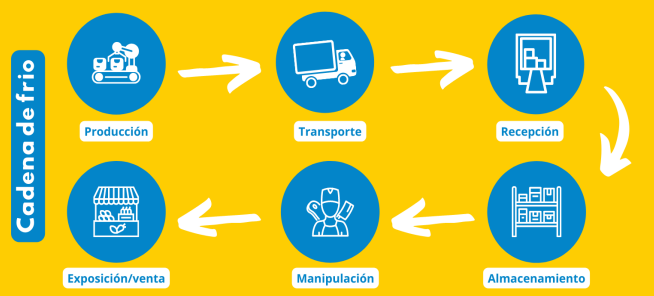 Pues bien, la cadena de frío consiste en mantener el frío (refrigeración o congelación) a su temperatura adecuada durante todo el proceso por el que pasa el alimento: producción, transporte, recepción, almacenamiento, venta al consumidor.