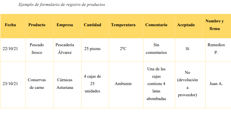 Se hará un registro de los productos que llegan anotando todo lo referente al producto, indicando, día de llegada, la empresa que lo envía, lote, cantidad de productos, y posibles comentarios. En caso de tratarse de productos en frío, también debe anotarse la temperatura a la que llegan. Cada empresa tendrá un formulario específico que deberás completar en cada recepción.